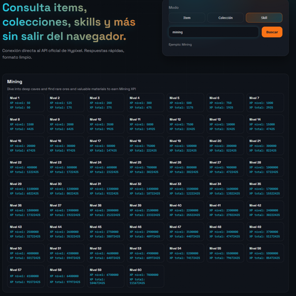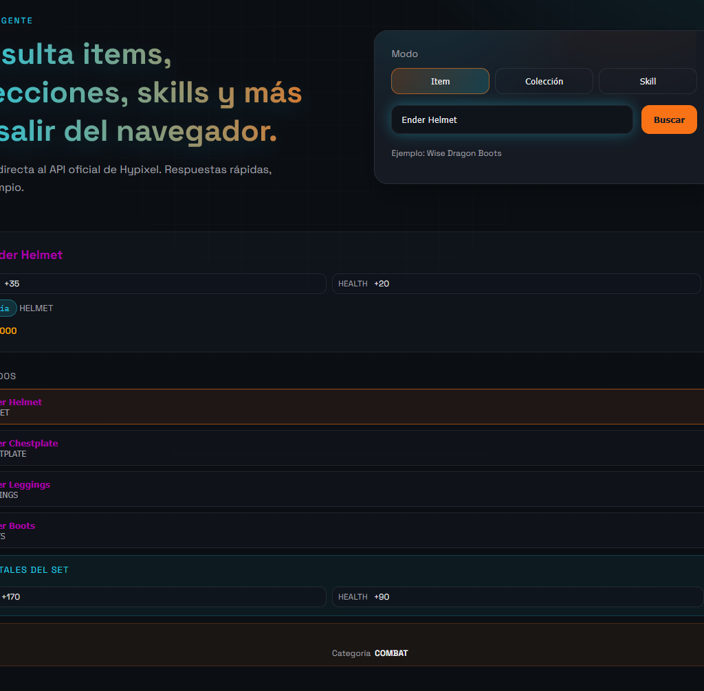 La primera fase fue bastante directa en apariencia: conectar con la API pública de Hypixel y empezar a mostrar información de:
