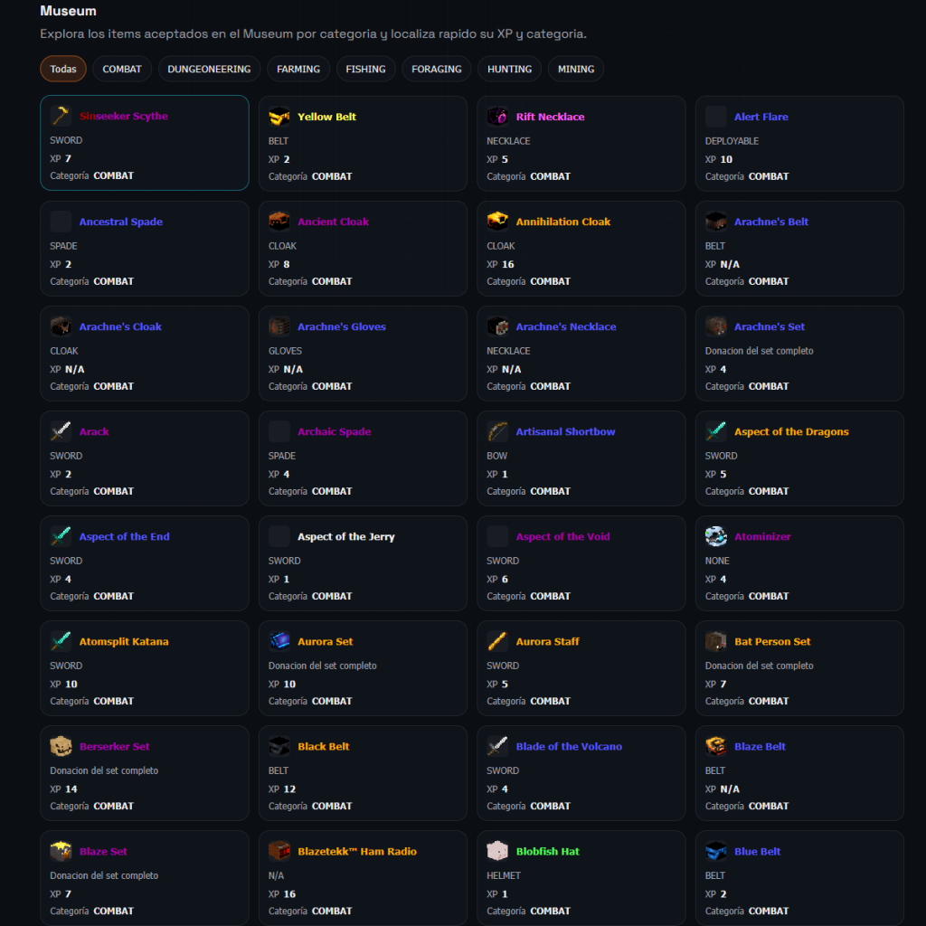 La sección de Museum nació como una necesidad natural del proyecto. Una vez que ya teníamos items bien renderizados, tenía todo el sentido construir un navegador dedicado que permitiera explorar:
